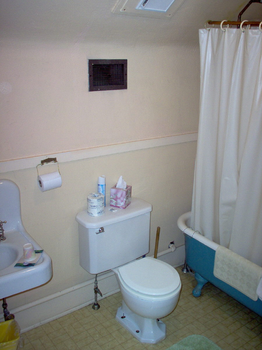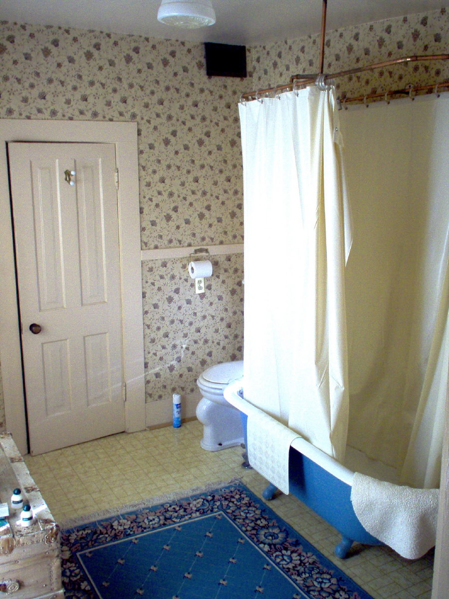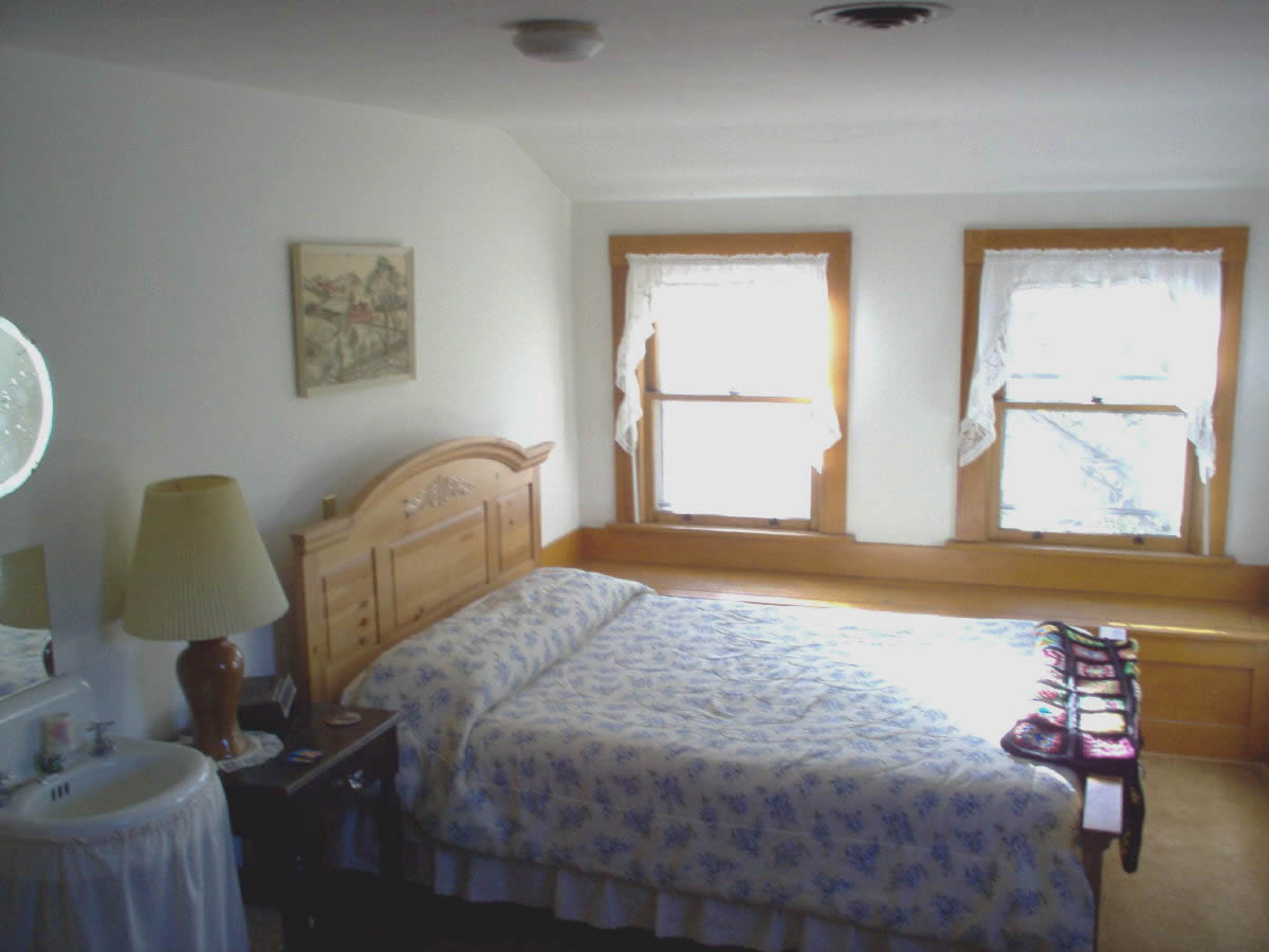 Sunny rear corner room with a double bed, wash basin and private unattached bath with claw foot tub/shower.